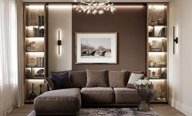 Установите на стене гостиной полки и ниши, где можно разместить коллекции книг, фигурок, растений или других декоративных предметов. Это не только функционально, но и стильно.